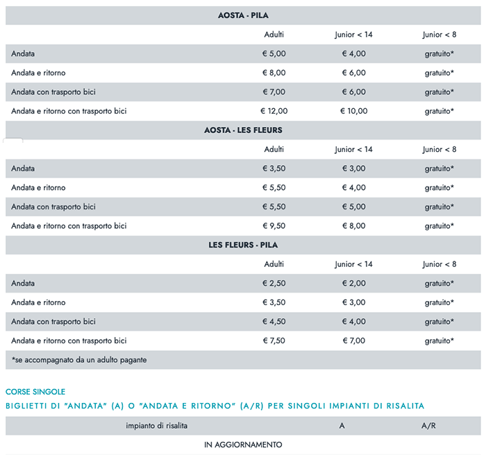 Tariffe impianti corse singole - Pila