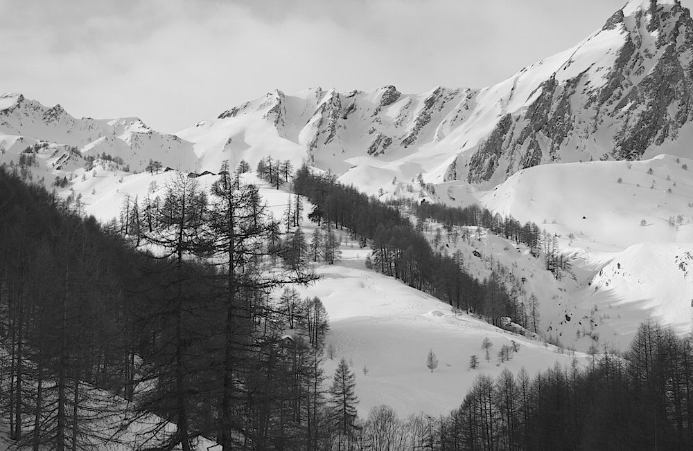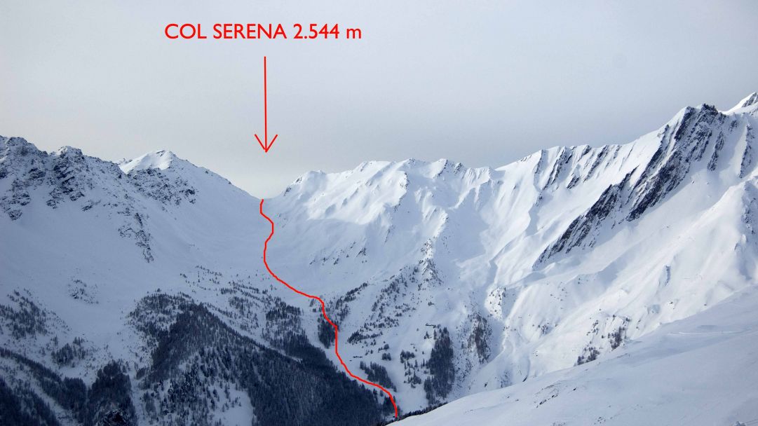 Qui lo sguardo si sposta inevitabilmente a destra verso l’ampia e imponente Costa Serena che si colloca ad oltre 2.700 metri di quota, dai pendii decisamente più esposti e ripidi per i quali occorre prestare la massima attenzione, ma che può regalare neve polverosa per lunghi periodi. Sulla sinistra si staglia invece la Testa di Serena di 2.830 metri di quota e la Cresta di Corléans i cui canali sono un ulteriore invito che va colto solamente dopo aver valutato molto bene la situazione presente e i bollettini nivometeorologici.