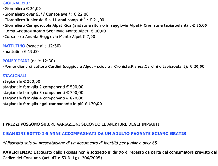 Prezzi Skipass