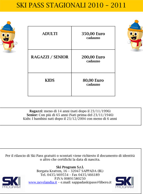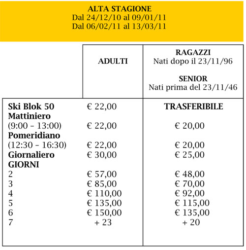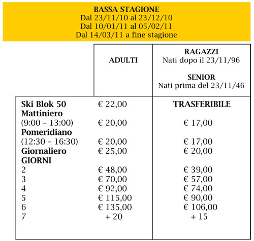 TARIFFE SKIPASS SAPPADA STAGIONE 2010/2011