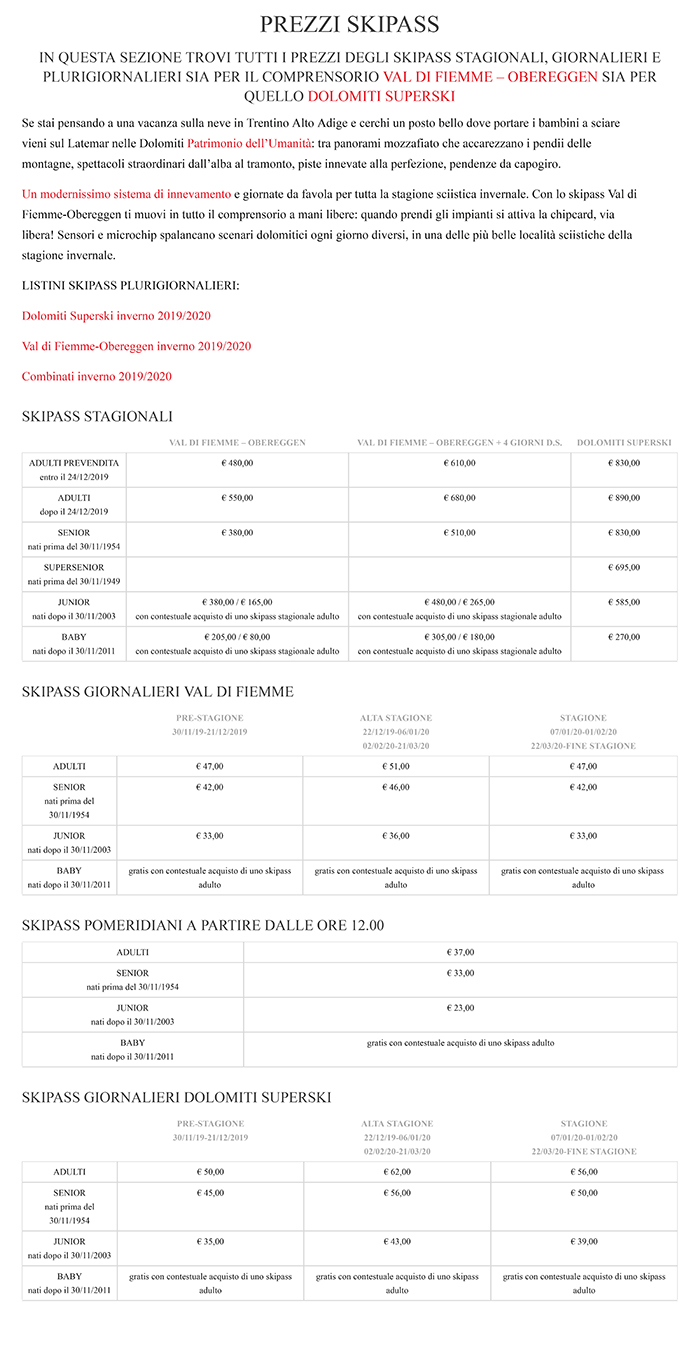 Skipass Pampeago Predazzo Obereggen 2019/2020