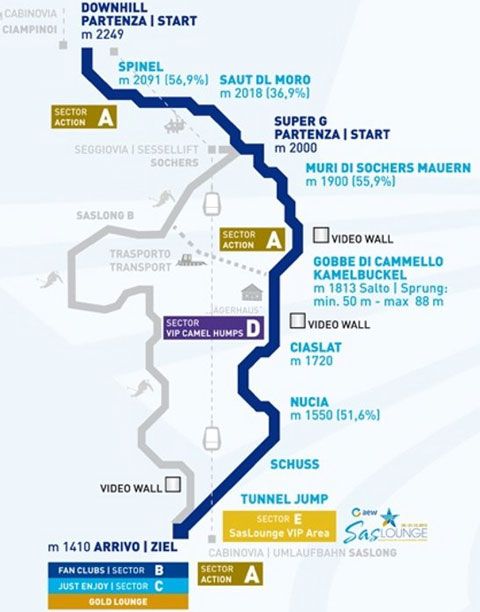 Hermann Maier disse della Saslong "Le parti che mi piacciono piú sono la partenza con la "S" e il muro subito dopo e naturalmente le Gobbe, uno di quei punti che decidono se andrai sul podio oppure no"