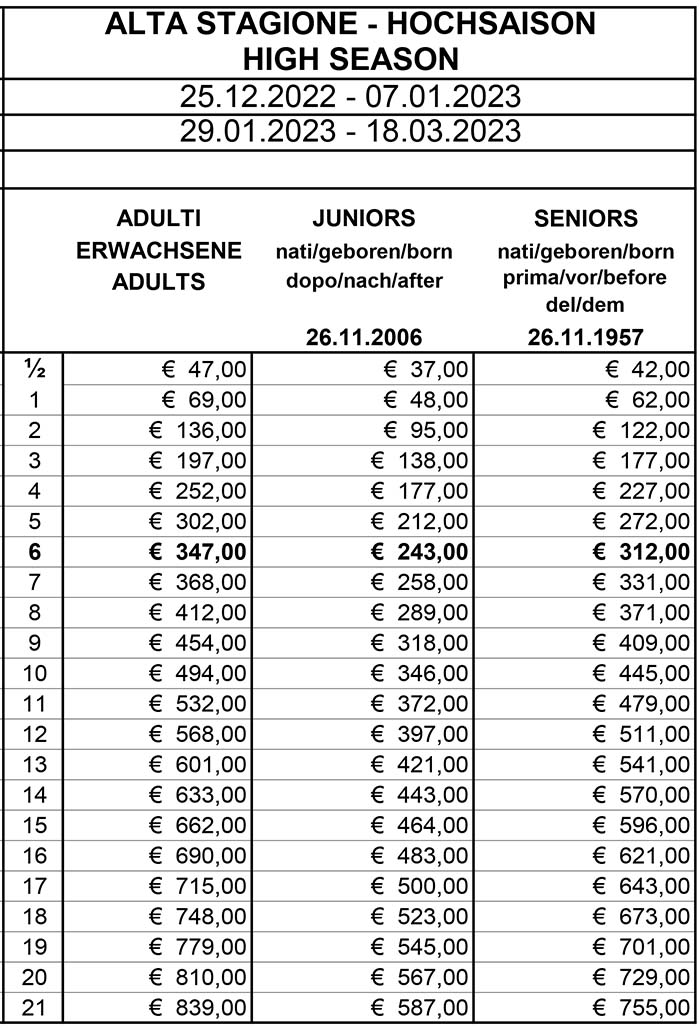 Skipass Alta Stagione Val Gardena 2022/2023