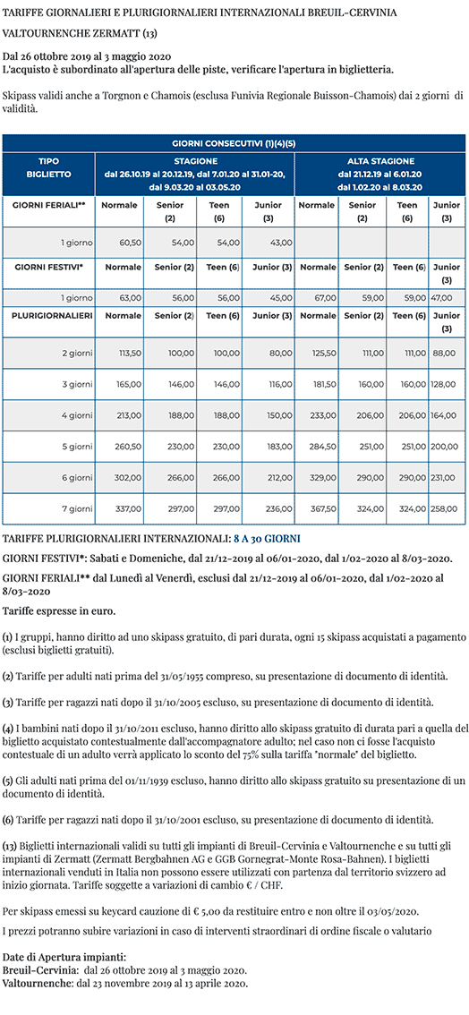 Skipass Cervinia Valtournenche Zermatt 2019/2020
