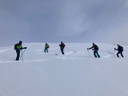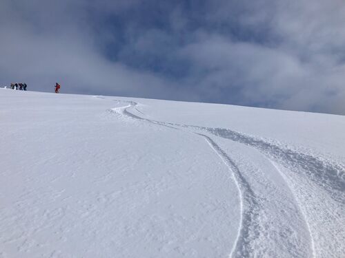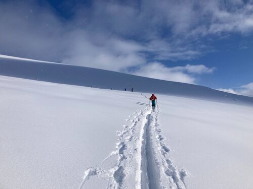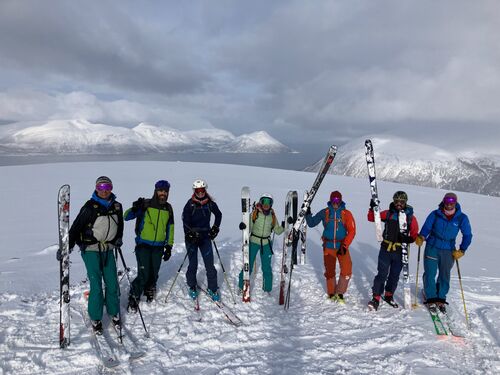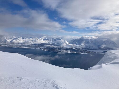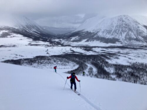 Eccitazione è la parola di oggi. Sveglia ore 6, l’obiettivo è la zona a nord di Tromso, dove il tempo pare essere migliore. Partenza quota 130m in un ambiente freddo (che per tutta la giornata non salirà oltre i 0°) ma intiepidito finalmente da qualche raggio di sole. 40 cm di fresca tutta da battere. Il meteo cambia molto rapidamente e ci troviamo nella seconda parte della gita in un banco di nebbia. Altrettanto velocemente, però, la situazione si ribalta e torna il sereno per lasciarci godere un commovente panorama (Ullstinden punta sud, 1078m). Il mare oggi è blu e lo possiamo vedere sia a destra che a sinistra, e scorgiamo isolotti e penisole. Disegniamo linee infinite sugli ampi pendii di discesa.