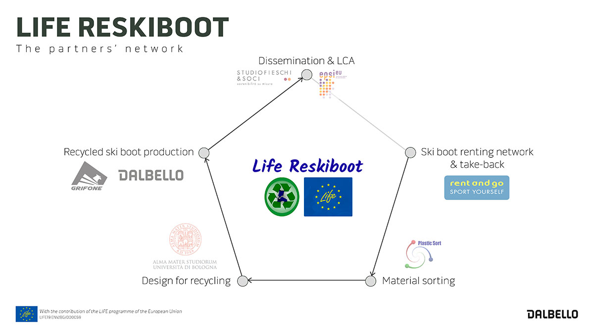 Da settembre 2020 Dalbello, insieme a sei partner di diversi settori, è partecipante ufficiale al progetto LIFE RESKIBOOT. L'obiettivo del progetto, cofinanziato dalla Commissione Europea, era ripensare il ciclo di vita di uno scarpone da sci in termini di sostenibilità e conservazione delle risorse e allo stesso tempo ridurre i costi per scarpone del 7%. Concentrandosi sulle società di noleggio, l’obiettivo era quello di sviluppare un sistema di ritiro e riutilizzo che fornisse un’alternativa ai nove milioni di chilogrammi di rifiuti di plastica provenienti dagli scarponi da sci post-consumo inviati in discarica ogni anno.