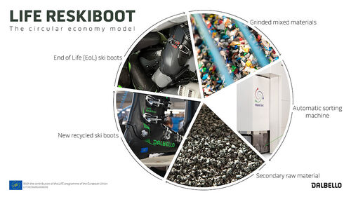 Queste materie prime secondarie ottenute dal riciclo sono il pezzo decisivo del puzzle e sono in contrasto con i 9,4 milioni di chilogrammi di materie prime vergini che vengono lavorate ogni anno – emettendo 33.800 tonnellate di CO2 equivalente – nella produzione convenzionale di scarponi da sci. Gli approfondimenti sulla progettazione per il riciclaggio sono stati forniti da studi condotti presso l'Università di Bologna e hanno gettato le basi per l'ulteriore processo produttivo. Nello stabilimento Dalbello le parti in plastica dura vengono macinate finemente e reimmesse nel ciclo produttivo dello scafo riducendo drasticamente l'utilizzo di materie prime vergini. Inoltre, le parti morbide selezionate dei rivestimenti sono state macinate, ricompattate in blocchi e trasformate in rivestimenti riciclati presso GRIFONE S.R.L.. Come altri partner cruciali, EPSI e Studio Fieschi hanno supportato il progetto in termini di una valutazione sistematica e completa degli impatti ambientali associati al prodotto durante tutto il suo ciclo di vita e la diffusione dei risultati del progetto e di preziose informazioni a un pubblico più ampio. Alla fine del ciclo è di nuovo il partner di noleggio, che rimette in circolazione e sulle piste le prime 1.000 paia.