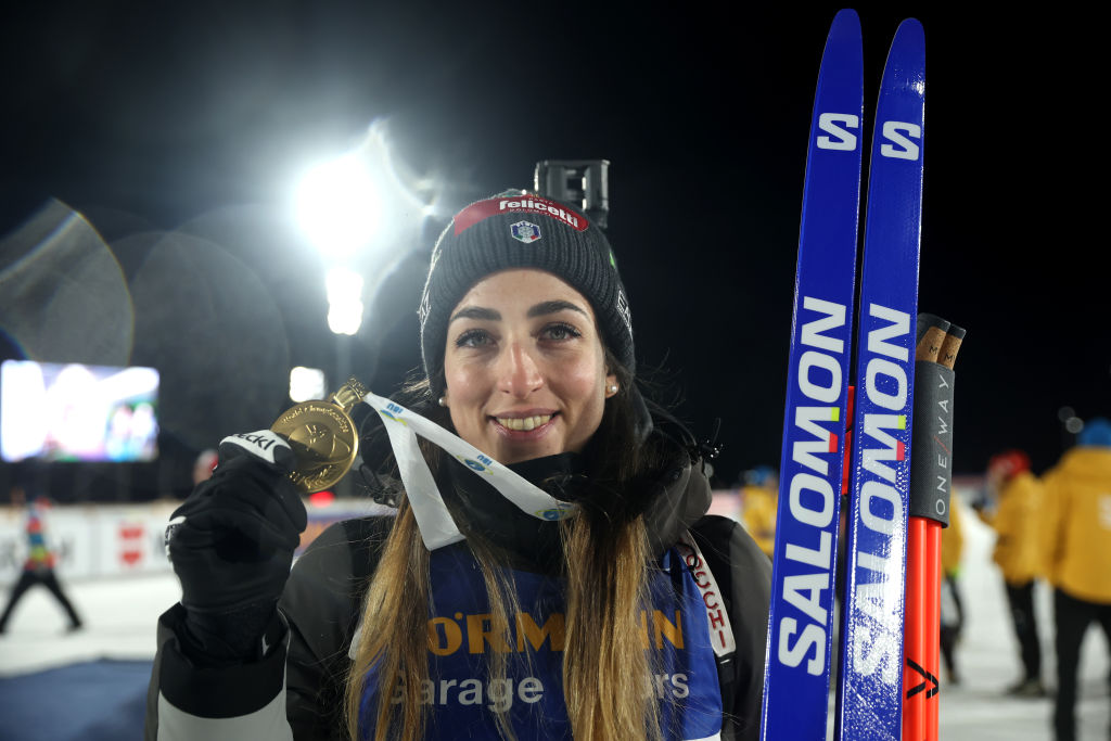 Irradia felicità Lisa Vittozzi dopo avere indossato la medaglia d'Oro per il primo titolo mondiale di una carriera già ricca di soddisfazioni che la ha portata ieri a toccare le dieci medaglie in una rassegna iridata alle quali va aggiunta la medaglia di Bronzo olimpica nella Staffetta Mista di PyeongChang 2018.