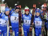 In apertura Dorothea Wierer ha faticato parecchio al poligono, dove ha mancato sei bersagli, equamente divisi tra le due sessioni di tiro, ma è riuscita a utlizzare al meglio le ricariche. Al primo cambio l'Italia è quindi passata sesta a 18" dalla Slovacchia. Lisa Vittozzi con una serie a terra di alto livello si è riportata in vetta alla gara, ma è stata poi costretta a compiere un giro di penalità al termine del poligono in piedi. Nonostante questo è riuscita a mantenersi nelle posizioni di vertice, passando il testimone a Dominik Windisch in 5a piazza.