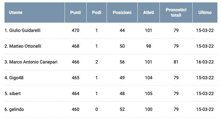 Dopo la prima giornata delle finali di Courchevel Giulio Guidarelli è balzato in testa anche alla classifica generale con 470 pti, scavalcando Matteo Ottonelli Marco Antonio Canepari. I verdetti in questo caso li avremo solo domenica al termine dello slalom maschile e tutto potrebbe ancora accadere, dal momento che sei giocatori sono racchiusi nel giro di 10 pti.