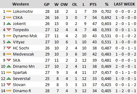 Il Lokomotiv mantiene la testa della conference dopo una settimana nettamente negativa dove il bilancio parla solo di due sconfitte, entrambe in trasferta, con il Traktor Chelyabinsk e il Neftekhimik. Ai Ferrovieri di Yaroslavl si avvicinano il CSKA, che nell'unica partita della settimana ha superato la Dinamo Mosca, e i finlandesi dello Jokerit che scavalcano la Torpedo, grazie a due vittorie casalinghe con l'Avtomobilist e l'Ugra e una rocambolesca sconfitta, sempre a Helsinki, agli shootout con la Dinamo Riga dopo essere stati in vantaggio per 5-0 al secondo intervallo. A centro classifica conquista una posizione il Vityaz grazie alla vittoria a Cherepovets mentre continua l'agonia dei campioni in carica dello SKA di San Pietroburgo che nell'unica uscita della settimana perde ad Astana con il Barys. La peggiore squadra della settimana è lo Slovan Bratislava che scivola dalla decima alla tredicesima posizione con due sconfitte nei 60 minuti con avversari agevoli come il Lada e il Medvescak e una allo shootout con il Bars Kazan