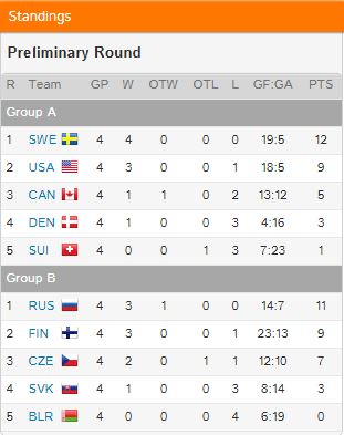 Nell'altra partita del gruppo gli Stati Uniti hanno conquistato il secondo posto superando la Danimarca con il punteggio di 4-1: gli statunitensi sabato affronteranno la Repubblica Ceca,