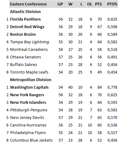 C'è aria nuova, invece, nella Atlantic Division dove attualmente nei playoff entrerebbero ben due new entry: i Florida Panthers che guidano la classifica e i Boston Bruins, terzi. L'unica conferma nelle prime tre posizioni è rappresentata dai Detroit Red Wings. A meno di clamorosi cambi di marcia a rischiare l'esclusione dalla post season sono i Montreal Canadiens che nella scorsa stagione chiusero al comando della Division.