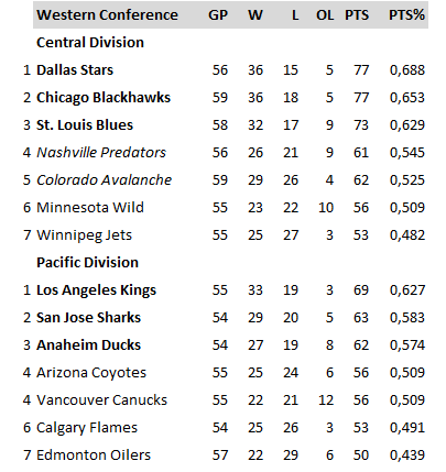 Con i Predators al 54,5% e gli Avalanche al 52,%, qualche speranza di wild card nella Western Conference restano solo alle tre squadre al 50,9%: Minnesota nella Central e Arizona Coyotes e Vancouver Canucks nella Pacific.