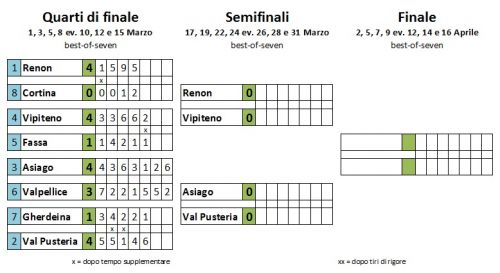 Con il tabellone dei playoff che non presenta sorprese e conferma le gerarchie della stagione regolare, nella parte alta, la Rittner Buam, vincitrice della regular e unica a attraversare i quarti senza sconfitte contro Cortina, affronterà i Broncos di Vipiteno che hanno eliminato i Fassa Falcons in 5 partite.