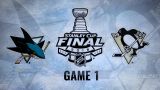 Come da tradizione che dura ormai dal 2010 , gara 1 della Finale per la Stanley Cup viene decisa per un solo goal dopo una partita dove le due finaliste si sono alternate nella gestione del gioco. Con gli Sharks nuovi all'atmosfera della finale, i padroni di casa di Pittsburgh partono forte e dopo 14 minuti sono in vantaggio di due goal: segnano, nel giro di 62 secondi i rookie Rust, che ha già messo la sua firma sulla vittoria in gara 7 su Tampa Bay, e Sheary. San Jose reagisce nel secondo periodo e riesce a raddrizzare la partita con Tomas Hertl e Patrick Marleau. Il merito dei Penguins, supportati da un ottimo Murray in porta, è quello di arginare l'ondata e aspettare tempi migliori che arrivano nel terzo periodo, a meno di tre minuti dalla sirena finale, quando Nick Bonino approfitta di una dormita della difesa Sharks e mette in rete il puck, servito da Kris Letang, per la vittoria.