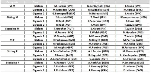 Nella categoria Sitting, il Bronzo di Sochi, l'austriaco Roman Rabl ha vinto entrambi i Giganti in programma  mentre nella prima giornata è stato il polacco Igor Sikorski a vincere lo Slalom. Due secondi posti per il trentaseienne giapponese Taiki Morii, campione del mondo del 2013 in Gigante e SuperG e medagliato a Torino 2006 e Vancouver 2010.