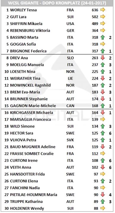 Uscita qualche settimana fa proprio per fare spazio a Sofia Goggia, Federica Brignone passa dall'ottavo al settimo posto della WCSL, dove Marta Bassino, con il terzo posto odierno guadagna due posizioni, a farne le spese è la slovena Ana Drev scalzata dalla doppietta azzurra.