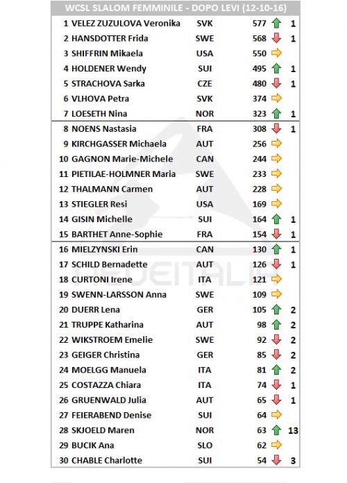 Mentre non vi sono altri passaggi di gruppo tra l'ottavo e il quindicesimo posto, entra nelle prime trenta l'altra norvegese Maren Skjoeld che a Levi, partita con il pettorale 31, ha chiuso al quinto posto con il miglior tempo della seconda manche che significano per lei un balzo di 13 posizioni. A farne le spese è l'infortunata Eva-Maria Brem che scivola dal 29° al 33° posto perdendo quattro posizioni. Fuori dalle prime trenta è notevole il balzo in avanti della svizzera Melanie Meillard che si issa fino alla trentacinquesima posizione (+40 rispetto alla precedente versione della WCSL).