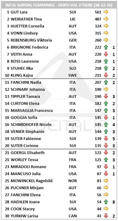 Irrompe nelle prime 10, le atlete che possono scegliere il loro pettorale tra quelli dispari dall'1 al 19, la slovena Ilka Stuhec scalzando la austriaca Tamara Tippler ancora ferma per lo stiramento al crociato riportato in Canada il cui rientro è previsto per Altenmarkt a metà gennaio. Proprio nella località del salisburghese si disputerà il prossimo SuperG e nelle settimane scorse si è parlato di questa gara come quella del possibile ritorno alle competizioni di Lindsey Vonn e Anna Veith senza alcuna conferma delle interessate. Le due sono a pieno titolo nelle prime dieci e una loro assenza significherebbe l'ingresso nelle "elette" delle due azzurre che in caso inverso rimarrebbero nel secondo gruppo, quello della estrazione a sorte dei pettorali dal 2 al 20, con Elena Curtoni, Francesca Marsaglia e Sofia Goggia