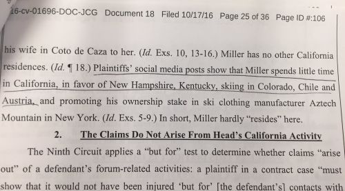Dallo stralcio pubblicato da Vinton, nella immagine qui sotto, appare chiaro come i legali di Head intendano mettere in discussione la giurisdizione della California sulla questione evitando un giudizio che potrebbe riservare amare sorprese. Si cerca di dimostrare, innanzitutto, come la residenza di Bode Miller in California sia fittizia: "I post sui social media mostrano come Miller spenda poco tempo in California, ma piuttosto si muova tra New Hampshire, Kentucky, scii in Colorado, Cile e Austria e promuova a New York la sua partecipazione azionaria nell'azienda di abbigliamento Aztech Mountain". Sebbene non completamente leggibile nello stralcio, il secondo punto per attaccare la giurisdizione californiana è relativa al fatto che la questione non riguardi le attività della filiale della California di Head.