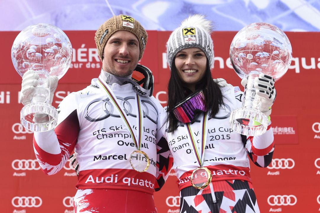 Hirscher festeggia assieme ad Anna Veith-Fenninger vincitrice tra le donne