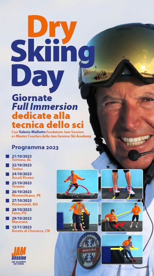 In attesa che inizi la stagione invernale, la Jam Session Ski Academy torna con “Dry Skiing Day”: nove giornate full immersion dedicate alla tecnica dello sci con tappa in diverse località d'Italia. Verranno proposti tanti esercizi a secco inediti ed efficacissimi per capire a fondo i movimenti più importanti ed essenziali.