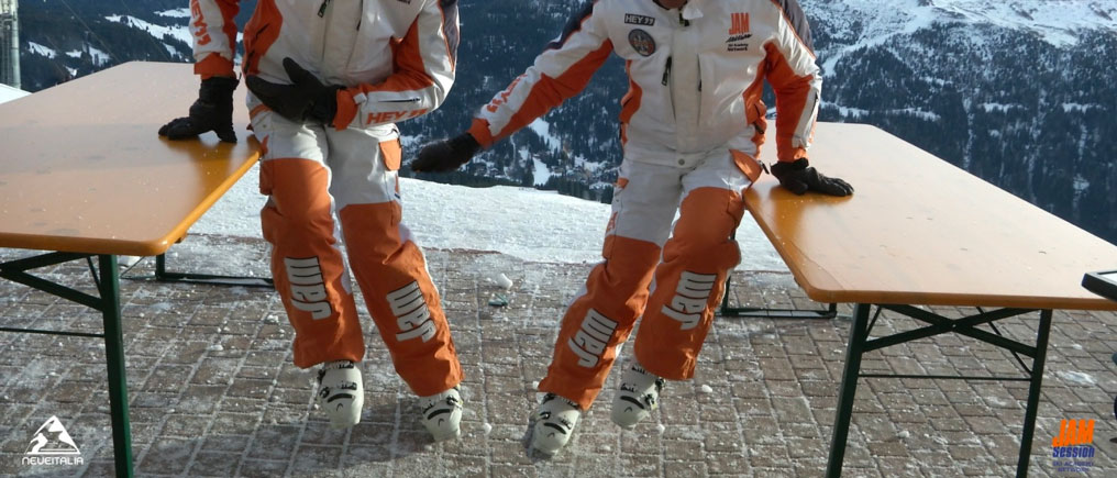 Per simulare l’assetto del corpo che assumeremo in una curva a destra ad esempio, andremo ad appoggiare al tavolo la nostra anca destra/gluteo destro, che dovrà salire ↑ per appoggiarsi; andremo contemporaneamente a puntellarci con il piede opposto (sinistro) avendo l’accortezza di mantenere una buona presa di spigolo /. La gamba interna (destra) non dovrà essere passiva e per ottenere questo anche il piede interno dovrà cercare una forte inclinazione all’interno dello scarpone
