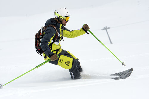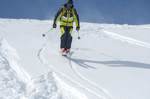 Può essere montato con un set-up da ski-touring per risalite con le pelli con dislivello massimo non superiore ai 600m.
