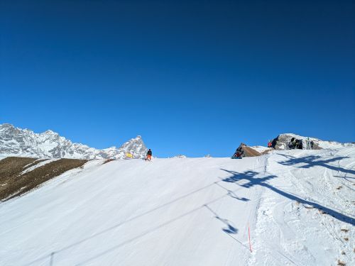 Dalla stazione di arrivo della seggiovia il panorama spazia dal Cervino alla conca di Cheneil. Evidenti anche le piste del vicino comprensorio di Cime Bianche-Valtournenche.